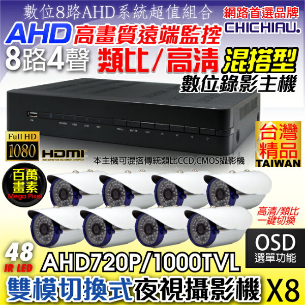 【CHICHIAU】8路AHD 720P數位高清遠端監控套組(含雙模切換48燈紅外線百萬畫素攝影機x8)